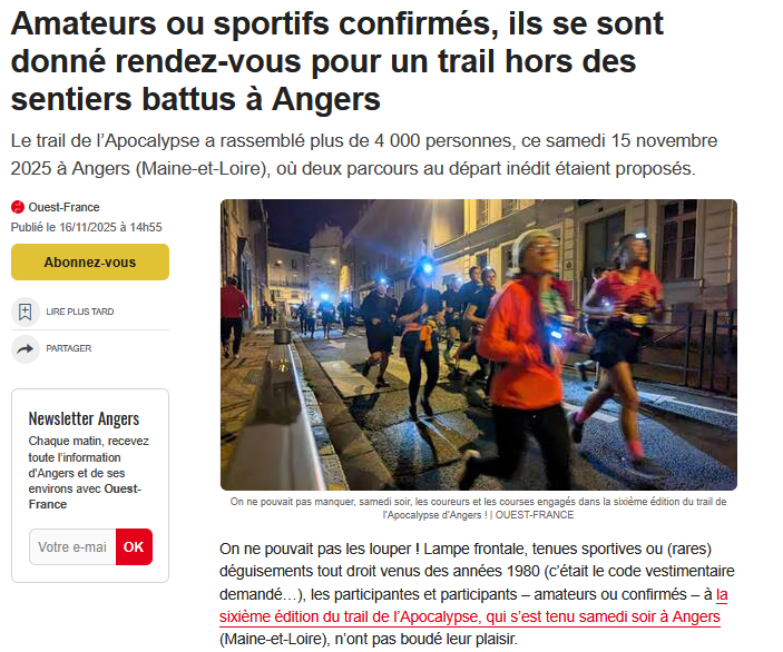 Nous tenons à remercier tous nos partenaires et la ville d’Angers qui ont permis l’organisation du 6e trail de l’Apocalypse. Ainsi que tous les bénévoles et les 4089 coureurs qui ont participé au succès de la soirée du samedi 15 novembre 2025 sous le thème des années 80.