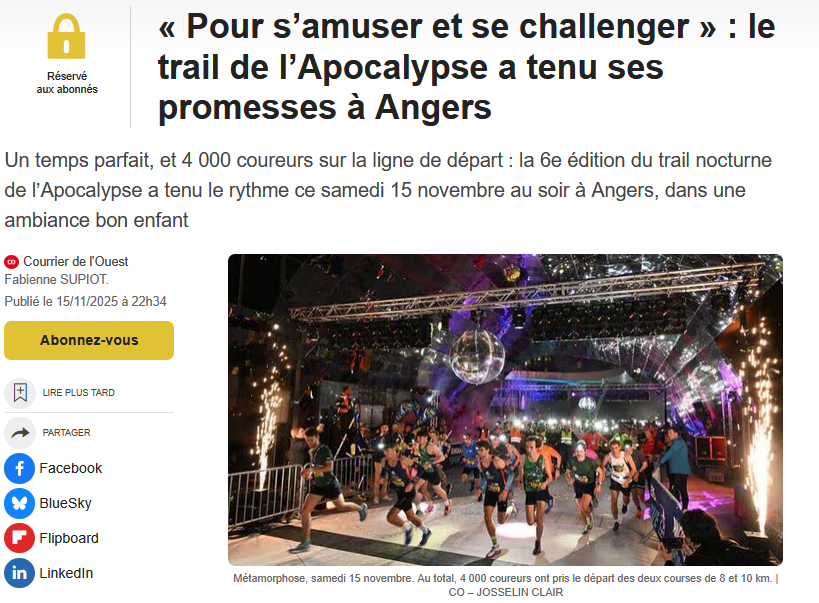 Nous tenons à remercier tous nos partenaires et la ville d’Angers qui ont permis l’organisation du 6e trail de l’Apocalypse. Ainsi que tous les bénévoles et les 4089 coureurs qui ont participé au succès de la soirée du samedi 15 novembre 2025 sous le thème des années 80.