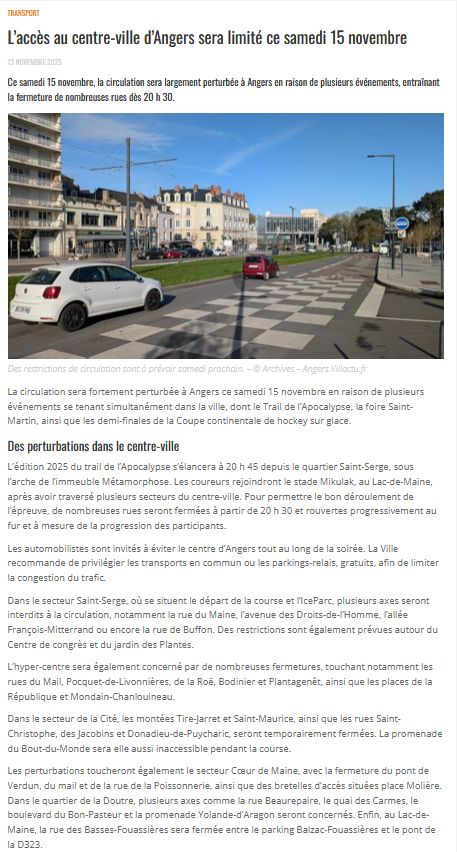 Articles du Courrier de l‘Ouest du 16 novembre 2025 Articles du Courrier de l‘Ouest du 15 novembre 2025 Article de Angers ville actu Quatre événements la même soiréeTélécharger